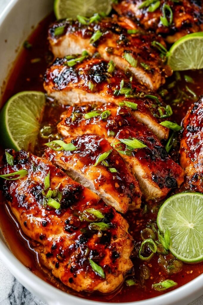 Honey Sriracha Chicken ist ein geschmackvolles, würzig-süßes Hähnchengericht mit knochenlosen, hautlosen Hähnchenbrüsten, die in einer würzigen und lebendigen Honig-Sriracha-Sauce gebacken werden. Die Sauce kombiniert Sriracha, Honig, Sojasoße, Essig, Limettensaft und Knoblauch für ein perfektes Gleichgewicht aus Schärfe und Süße. Dieses Rezept ist leicht zuzubereiten, perfekt für ein Abendessen unter der Woche und garniert mit frischem Koriander, Sesamsamen und Limettenscheiben für einen zusätzlichen Geschmacksschub.