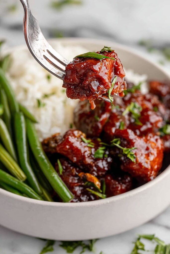 Bring das Hähnchen zurück in die Pfanne und vermenge es, um jedes Stück mit dieser köstlichen Sauce zu überziehen. Wenn alles glänzend und gut beschichtet aussieht, schalte die Hitze aus und lass es etwa 5 Minuten einwirken. Diese Ruhezeit lässt die Aromen wirklich miteinander verschmelzen und macht das Hähnchen noch zarter.