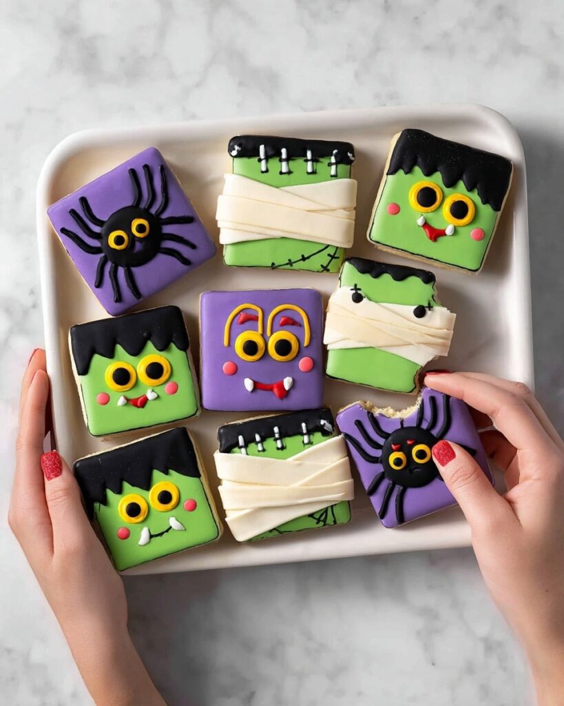 Auf einem weißen Tablett befinden sich acht quadratische Halloween-Kekse mit heller bunter Glasur. Vier Kekse sind grün mit weißen Mumien-Verbandslinien auf der obersten Schicht und gelben Augen, die in Schwarz-Weiß durchscheinen. Zwei lila Kekse zeigen Spinnenformen mit schwarzen Zuckergussbeinen an den Seiten und grünen Punkten oben und kleinen roten Reißzähnen am unteren Rand. Zwei weitere Kekse zeigen Gesichter: einer mit einer weißen Deckschicht, großen gelben und schwarzen Augen, einem breiten Lächeln mit roten Zungendetails und schwarzen Haaren auf der Oberseite, und der andere mit einem grünen Gesicht und schwarzen Haaren und Stichspuren am unteren Rand. Zwei Frauenhände halten Kekse mit kleinen Bissen aus den Ecken. Das Tablett sitzt auf einer glatten, weiß marmorierten Oberfläche. Foto aufgenommen mit einem iPhone --AR 4:5 --V 7Auf einem weißen Tablett befinden sich acht quadratische Halloween-Kekse mit heller bunter Glasur. Vier Kekse sind grün mit weißen Mumien-Verbandslinien auf der obersten Schicht und gelben Augen, die in Schwarz-Weiß durchscheinen. Zwei lila Kekse zeigen Spinnenformen mit schwarzen Zuckergussbeinen an den Seiten und grünen Punkten oben und kleinen roten Reißzähnen am unteren Rand. Zwei weitere Kekse zeigen Gesichter: einer mit einer weißen Deckschicht, großen gelben und schwarzen Augen, einem breiten Lächeln mit roten Zungendetails und schwarzen Haaren auf der Oberseite, und der andere mit einem grünen Gesicht und schwarzen Haaren und Stichspuren am unteren Rand. Zwei Frauenhände halten Kekse mit kleinen Bissen aus den Ecken. Das Tablett sitzt auf einer glatten, weiß marmorierten Oberfläche. Foto aufgenommen mit einem iPhone --AR 4:5 --V 7