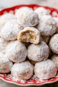 Das ist mein liebster verspielter Teil! Schlagen Sie Ihr Eiweiß, Weinstein und Zucker auf, bis sich glänzende, steife Spitzen bilden, und sprühen Sie dann kleine Runden und Stängel ein, um Pilze zu bilden. Vergiss nicht, die Oberseiten mit etwas Wasser zu glätten, um diesen realistischen Look zu erzielen. Mit Kakaopulver bestäuben und zwei Stunden lang bei 93 °C (200°F) langsam backen – hier zahlt sich die Geduld aus! Beim Abkühlen klebt mit etwas geschmolzener Schokolade die Oberseiten perfekt an die Stängel. Diese kleinen Pilze verleihen deinem Weihnachtsbaum so viel Persönlichkeit und Charme, glaub mir.