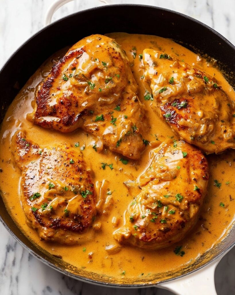 Dieses Rezept für ersticktes Hühnchen besteht aus saftigen, in der Pfanne gebratenen Hähnchenbrust, die in einer reichhaltigen, cremigen Zwiebelsoße gekocht wird. Das Gericht wird aus einfachen Grundnahrungsmitteln und gewürztem Mehl hergestellt und bietet tiefe, beruhigende Aromen mit zarten Hähnchenkoteletts, die in einer üppigen Sauce gekocht werden, die sich perfekt für eine herzhafte Mahlzeit eignet.
