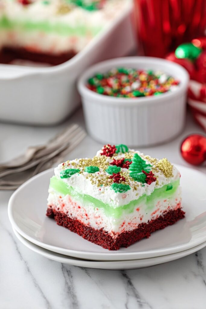 Feiern Sie die Feiertage mit diesem festlichen Weihnachts-Lasagne-Dessert mit Schichten von Red Velvet Cake, cremigem Käsekuchen-Frosting, grünem Vanillepudding und Schlagbelag, alles garniert mit bunten Streuseln und zerdrückten Zuckerstangen – eine köstliche Leckerei perfekt für Festtagstreffen.